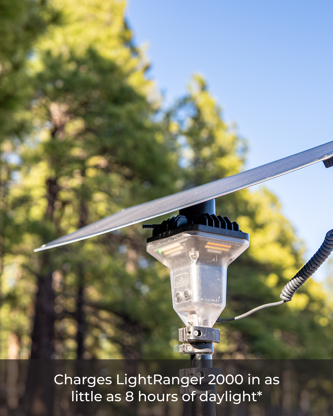 In direct daylight, the 20 Watt Portable Solar Panel can fully charge a LightRanger 800 or 1200 in as little as 5 hours and a LightRanger 2000 in as little as 8 hours. Actual charge time depends on the season, sun angle, and how directly sunlight hits the panel. Devos notes that solar output is strongest from April through September, and charging may take longer outside the summer months.