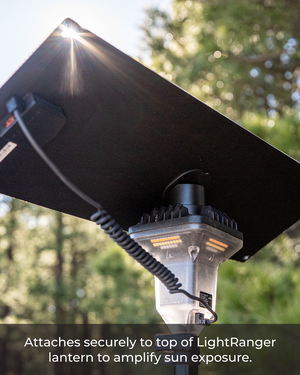 The 20 Watt Portable Solar Panel with LightRanger Receiver is designed to work with the LightRanger 800, 1200, 2000, and 4000. It includes a 30-degree angled receiver that attaches to the top of the lantern for a more integrated solar charging setup. Devos says this angled receiver helps optimize charging and can reduce charge times by as much as 30%.
